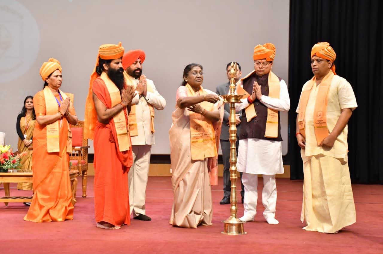 पतंजलि विश्वविद्यालय में आयोजित द्वितीय दीक्षांत समारोह में मुख्य अतिथि भारत की माननीया राष्ट्रपति द्रौपदी मुर्मू जी ने विश्वविद्यालय के स्नातक, परास्नातक एवं शोधार्थियों को उपाधियाँ और स्वर्ण पदक प्रदान किए। माननीया राष्ट्रपति महोदया ने कहा कि योग, आयुर्वेद और अध्यात्म के क्षेत्र में पतंजलि ने जो कार्य किया है, वह महर्षि पतंजलि की परंपरा को आगे बढ़ाने का महान प्रयास है।इस विश्वविद्यालय में शिक्षा के साथ संस्कार, विज्ञान के साथ आध्यात्म और ज्ञान के साथ व्यवहार का अद्भुत समन्वय है, जो ‘वसुधैव कुटुंबकम्’ की भावना को साकार करता है। इस अवसर पर उन्होंने विद्यार्थियों से आह्वान किया कि वे तपस्या, सरलता और कर्तव्यनिष्ठा को अपने जीवन का आधार बनाएं और भागीरथी की तरह कठिन परिश्रम कर समाज और राष्ट्र के उत्थान में योगदान दें। पतंजलि विश्वविद्यालय ने व्यक्ति निर्माण के माध्यम से राष्ट्र निर्माण का मार्ग अपनाया है। उन्होंने विश्वास व्यक्त किया कि पतंजलि विश्वविद्यालय के विद्यार्थी विज्ञान और अध्यात्म के समन्वय से आदर्श जीवन निर्माण में सहायक होंगे और पूरे विश्व में योग, प्राणायाम और भारतीय जीवनदर्शन का प्रसार कर भारत को पुनः विश्व गुरु बनाएंगे।