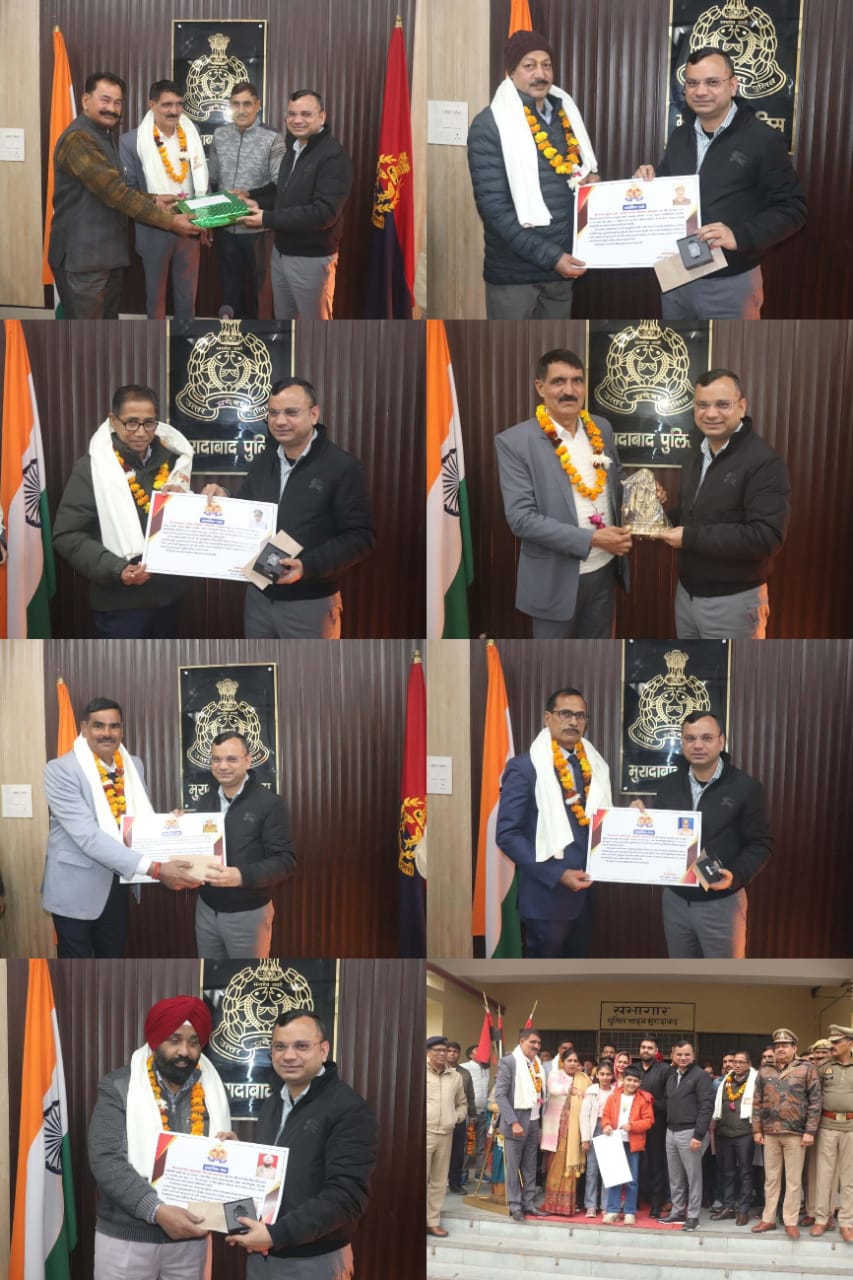 मुरादाबाद वरिष्ठ पुलिस अधीक्षक द्वारा पुलिस अधीक्षक,यातायात के साथ पुलिस विभाग से अधिवर्षता आयु पूर्ण कर, सेवानिवृत्त हुए पुलिस कर्मियों को पुष्प-माला, प्रशस्ति पत्र, अंग वस्त्र, घड़ी आदि उपहार भेंट कर सभी के अच्छे स्वास्थ्य एवं खुशहाल जीवन की शुभकामनाये देते हुये विदाई दी गई ।