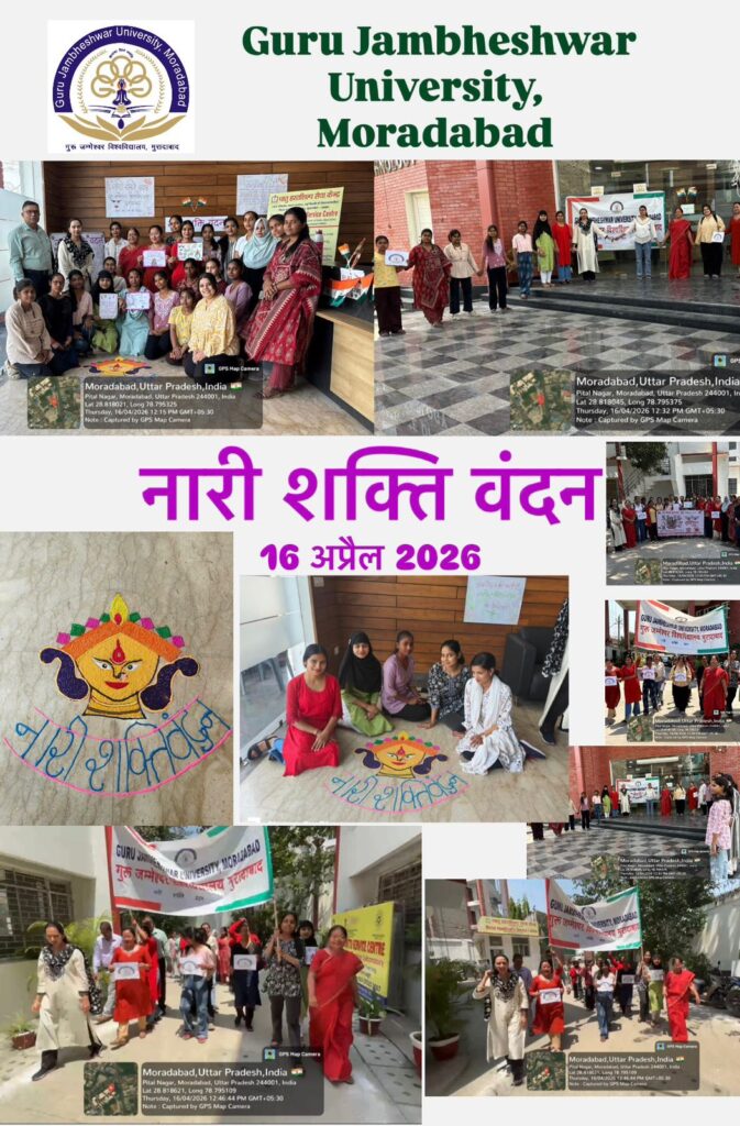 मुरादाबाद। गुरु जम्भेश्वर विश्वविद्यालय के एमएचएससी परिसर में “नारी शक्ति वंदन” विषय पर जागरूकता कार्यक्रम का आयोजन किया गया। कार्यक्रम में छात्र-छात्राओं ने उत्साहपूर्वक भाग लेते हुए महिला सशक्तिकरण का सशक्त संदेश दिया।